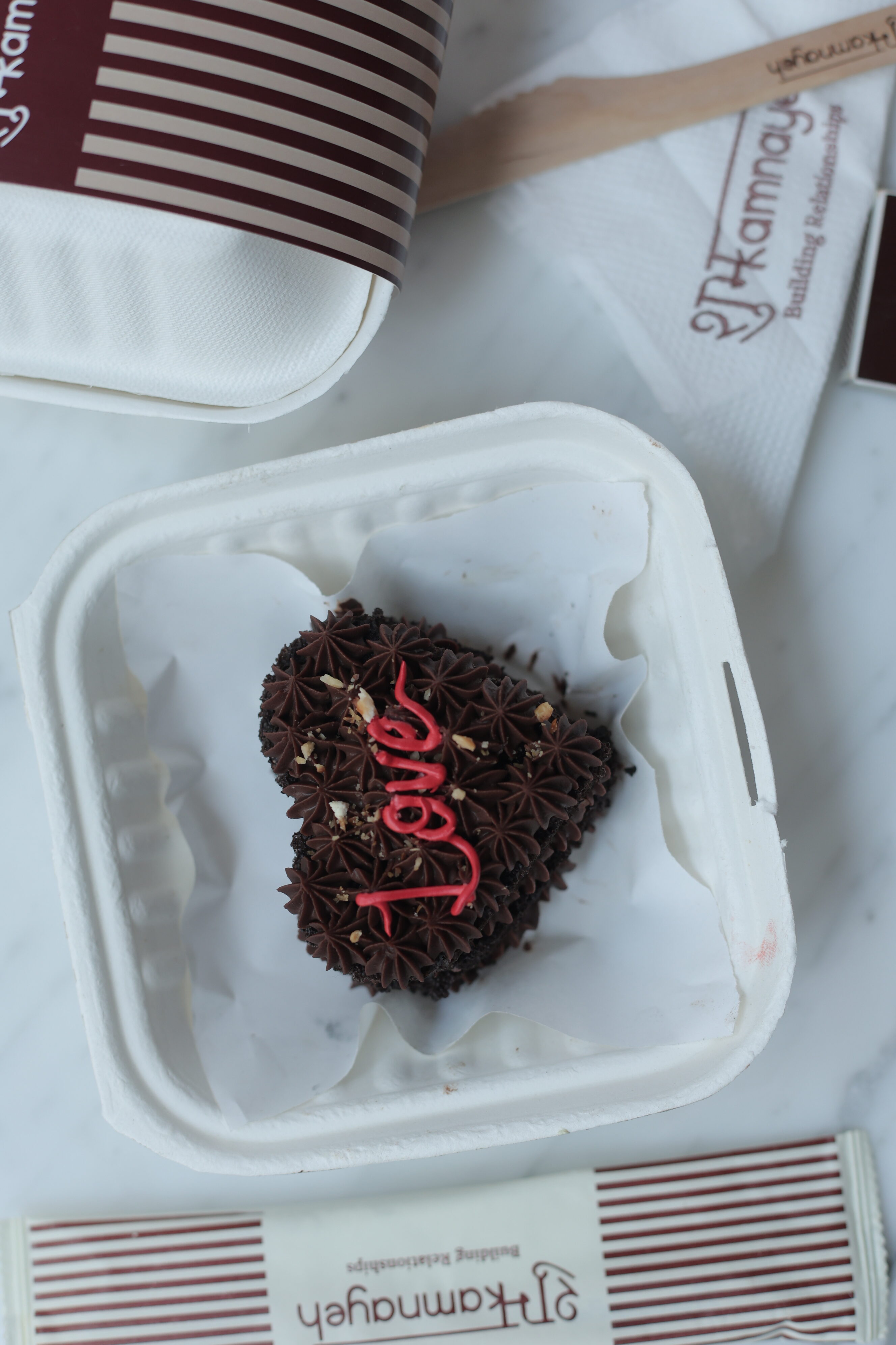 Brown chocolate heart shaped bento cake in hazelnut flavour