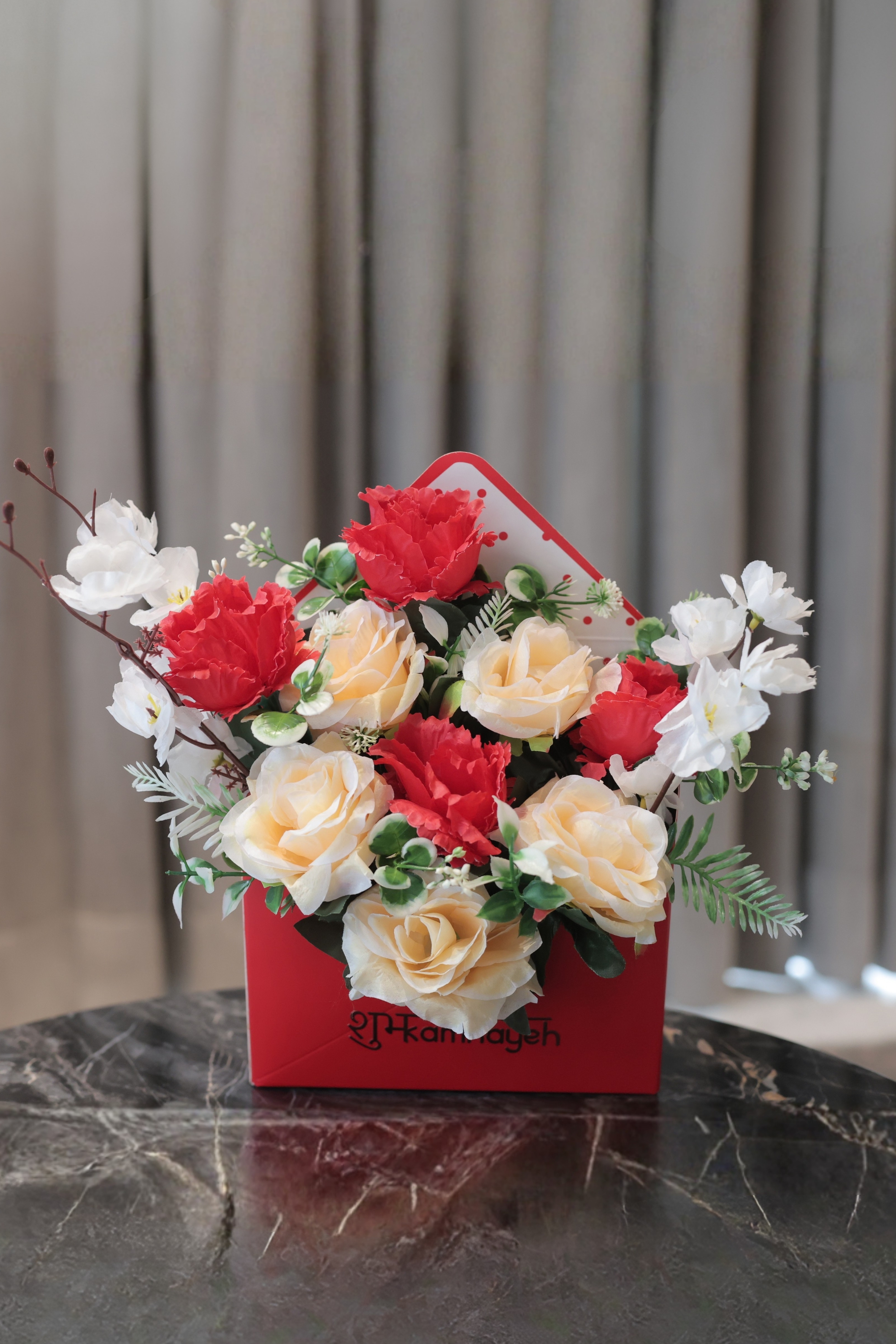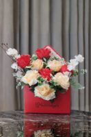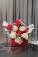An eye-catching envelope-style box filled with cherry blossom stems and everlasting roses in vibrant hues. Thoughtfully curated to express big emotions, this festive arrangement makes a bold and beautiful gifting statement.