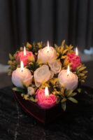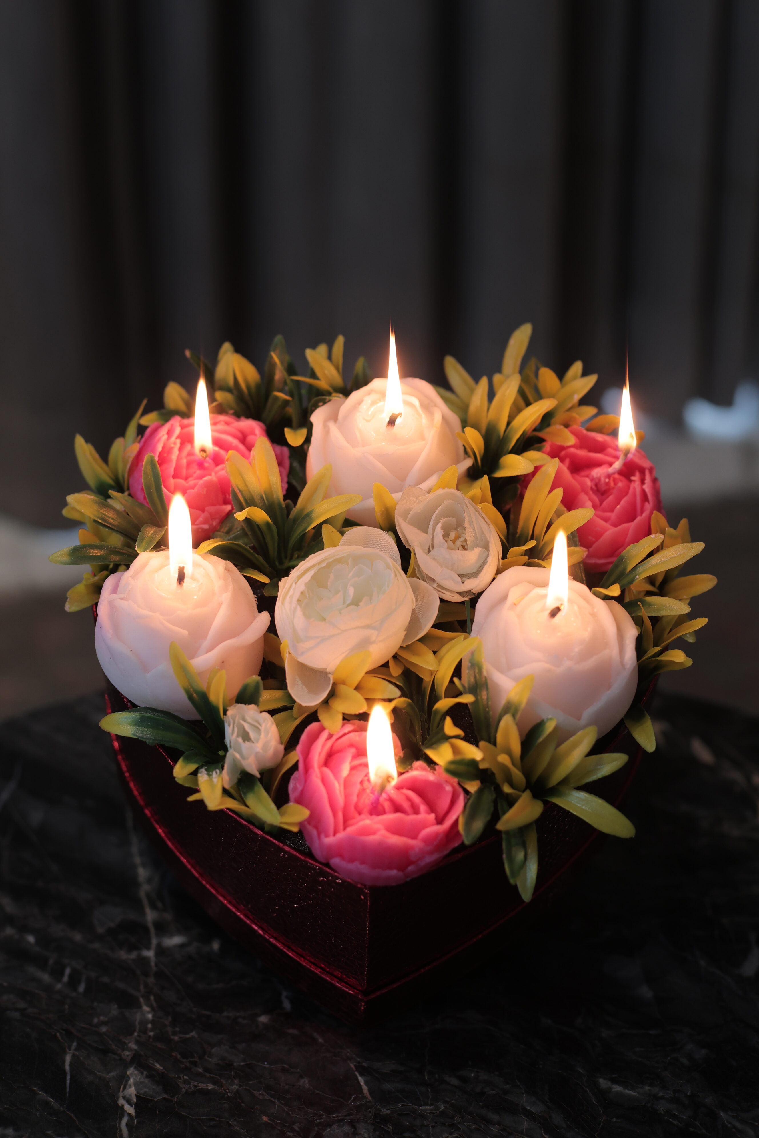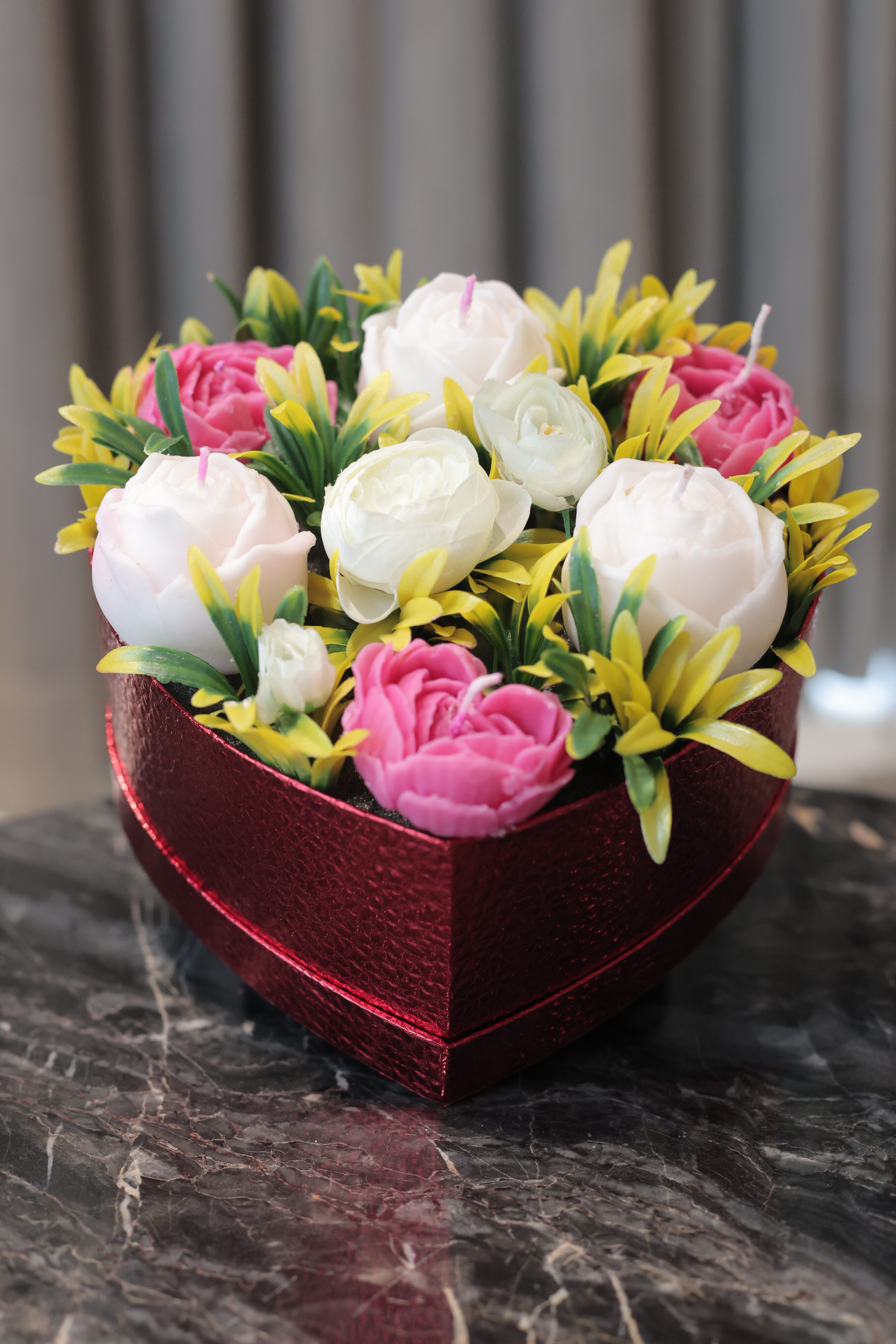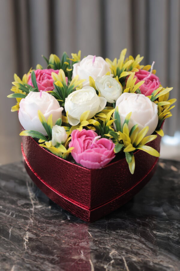 A charming red heart box featuring handcrafted flower-shaped candles paired with everlasting peony blooms and soft fillers. Designed to awaken the senses and create a warm, romantic ambiance, perfect for festive gifting and heartfelt surprises.