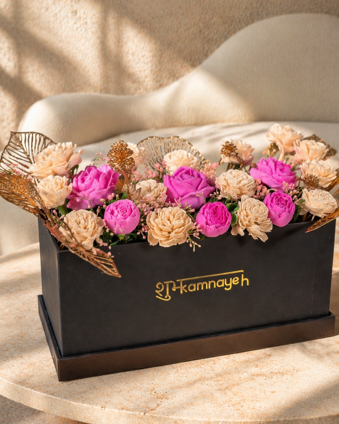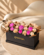 A refined mix of pink floral candles paired with golden fillers and ginkgo details. Designed to add warmth and sophistication to any space. Beautifully decorative with a soft, calming glow. Presented in a black rectangular box for a chic touch.