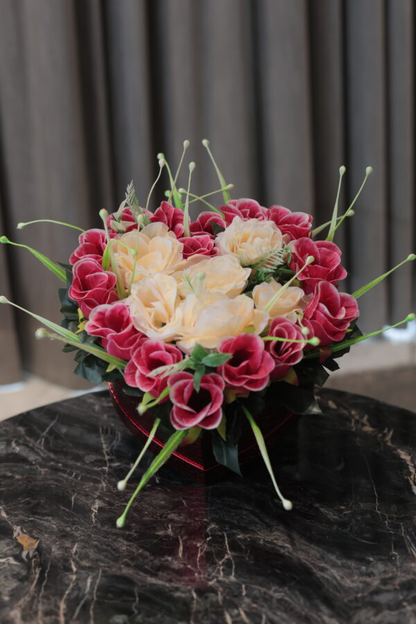 A timeless arrangement of everlasting pink and orange roses beautifully set in a red heart box. This floral keepsake symbolizes enduring love and joy, making it an ideal gift for celebrations that deserve to be remembered.
