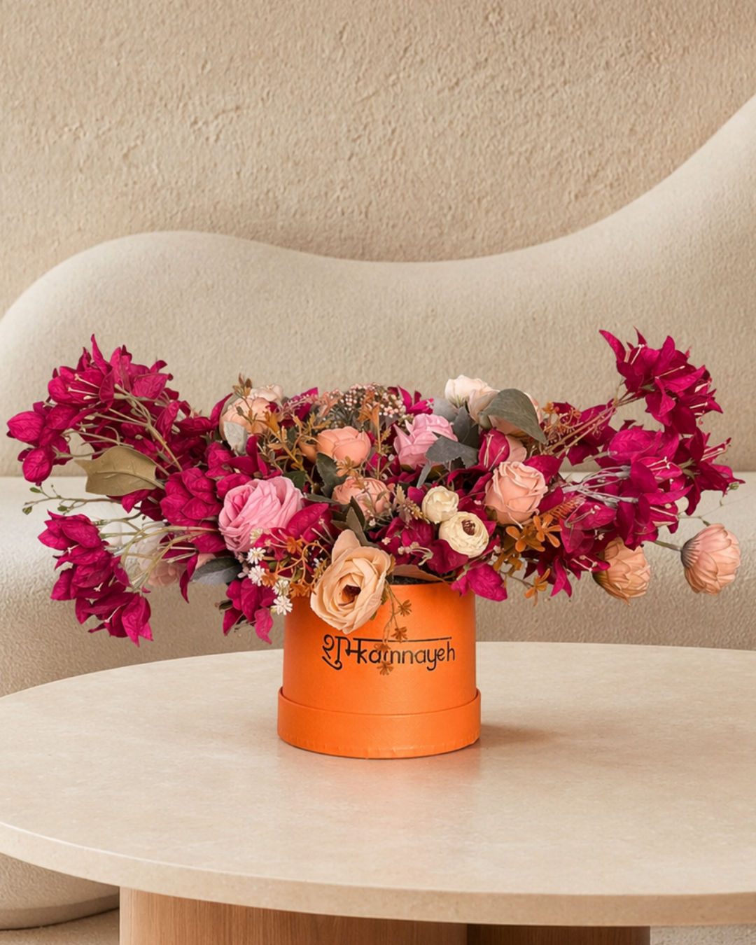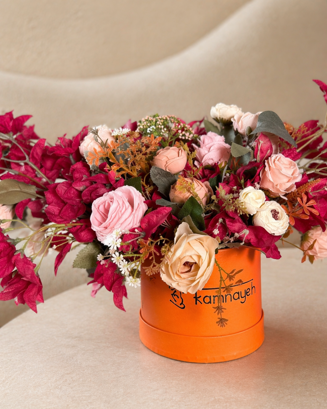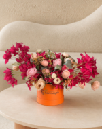 A lively mix of pink bougainvillea and roses balanced with classic white peonies. Fresh, vibrant, and full of charm. Everlasting blooms with zero upkeep. Set in a round orange box for a bright, statement finish.