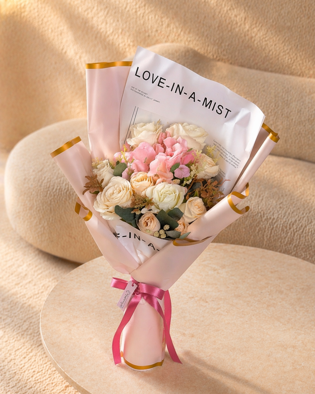 A charming arrangement of white roses with peonies and hydrangeas. Soft tones that exude elegance and warmth. Maintenance-free blooms that last beautifully. Wrapped in Korean paper for a minimal, luxe look.