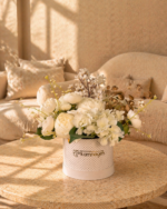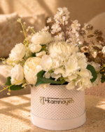 A graceful arrangement of white peonies, hydrangeas, and cherry blossoms with subtle golden accents. Designed to bring a soft, elegant charm to any space. Everlasting blooms that stay fresh with zero maintenance. Beautifully placed in a white polka dot hat box—perfect for gifting.
