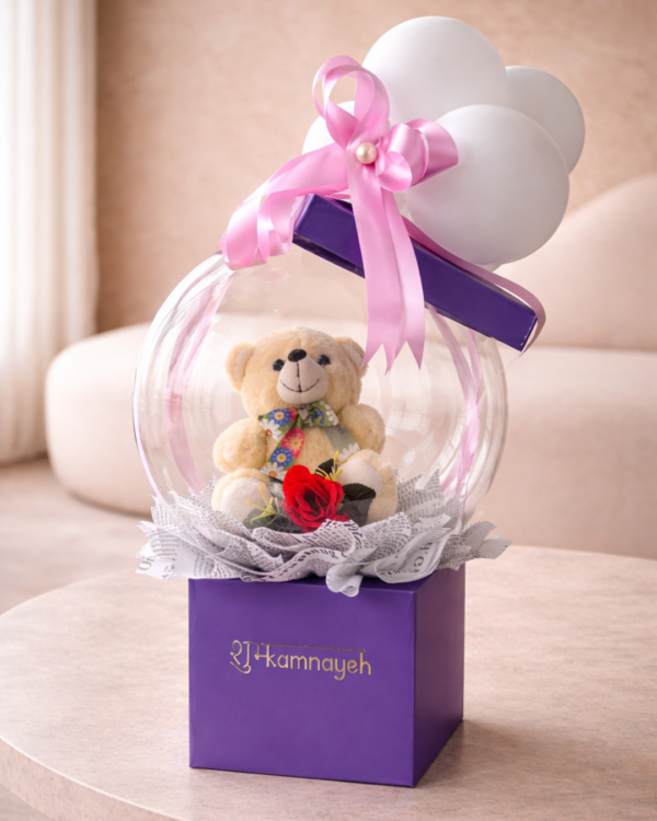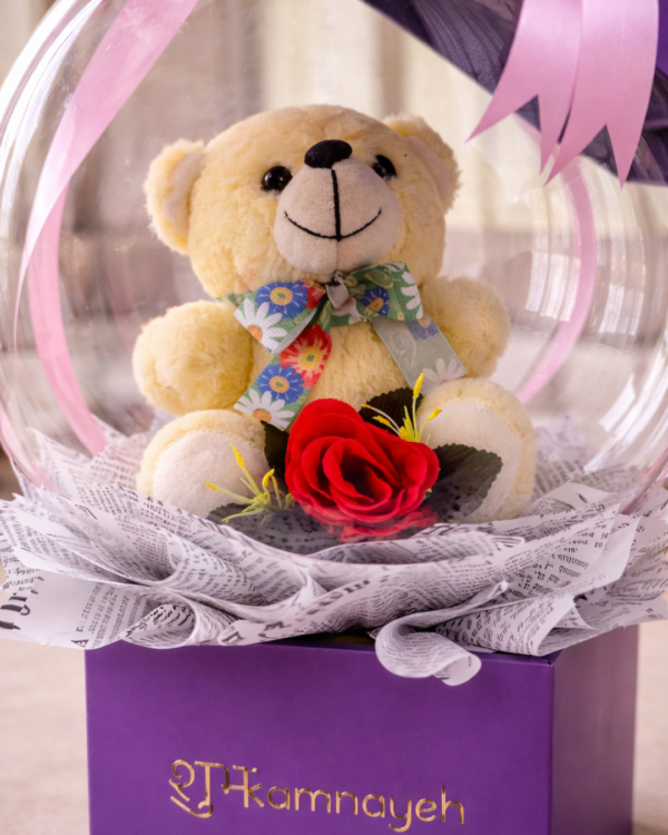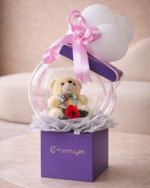 A delightful mix of a cuddly teddy and a classic red rose. Encased in a boba balloon for a modern twist. Finished with white balloons and soft ribbons. Presented in a purple square box for a playful, elegant look.