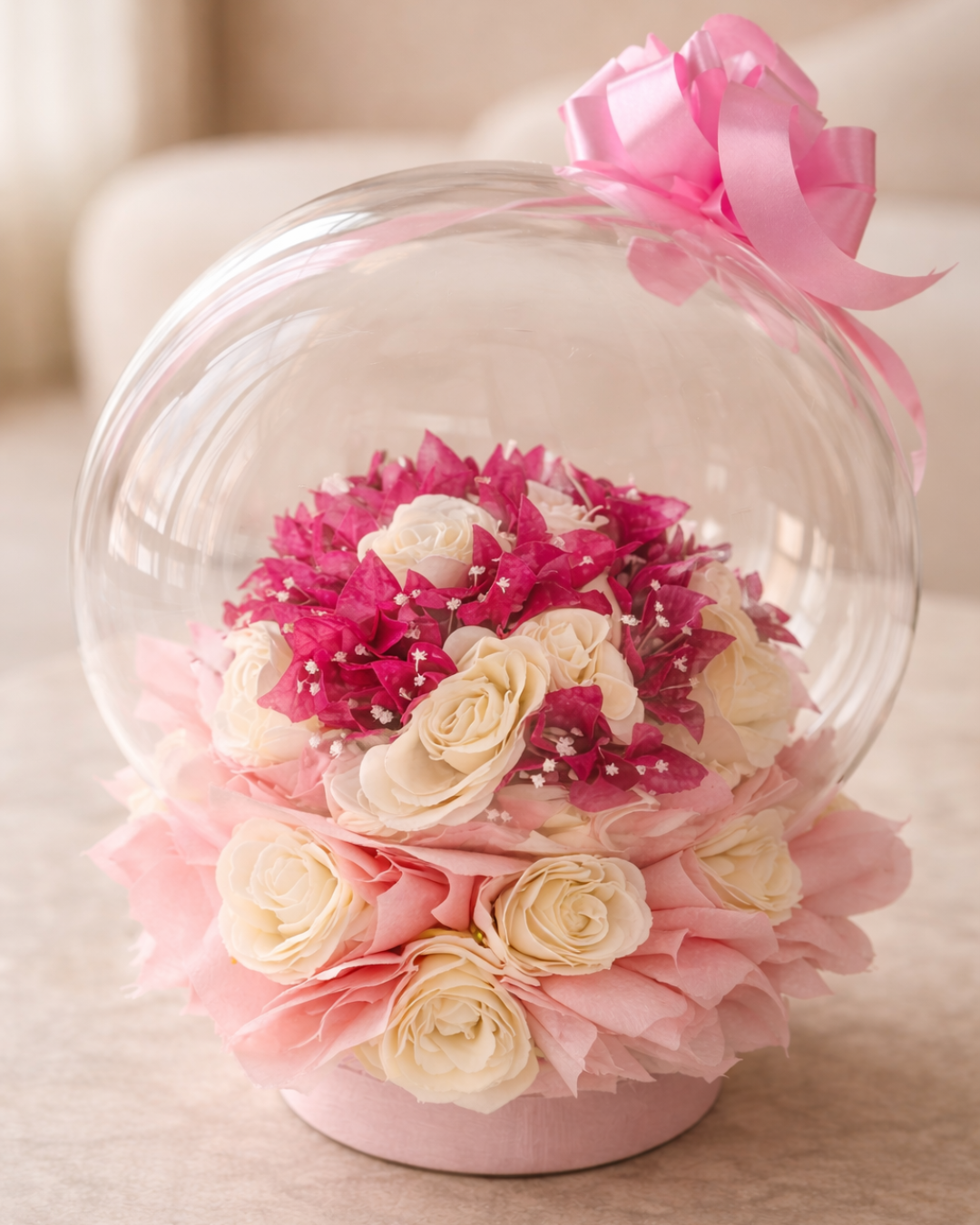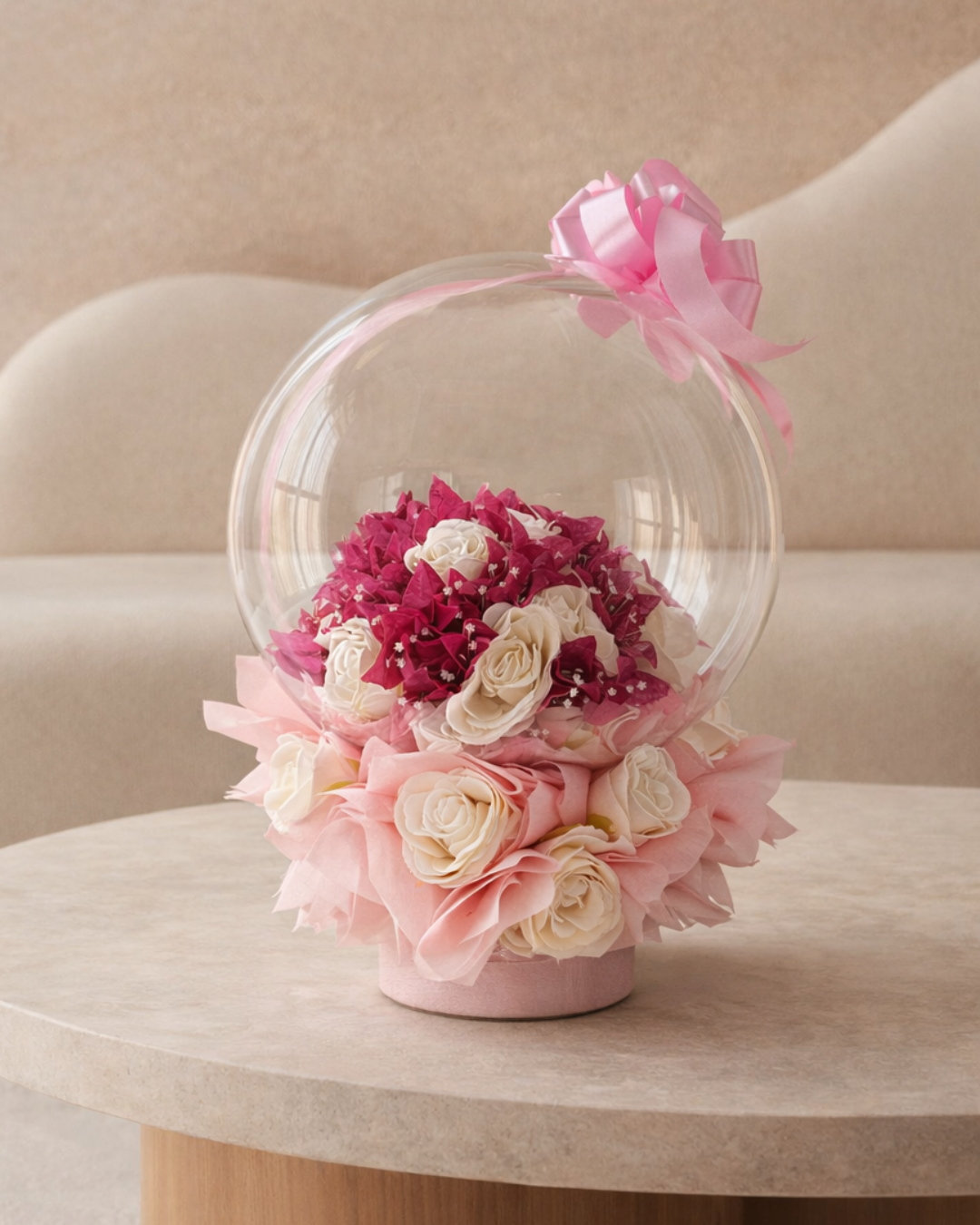 A delicate mix of white roses with vibrant bougainvillea highlights. Presented in a big boba balloon for a unique, contemporary feel. Maintenance-free blooms that last beautifully. Arranged in a glass vase for a minimal, luxe look.