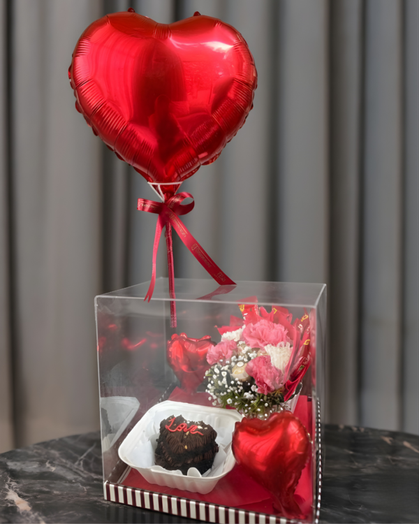 A romantic box arrangement of pink and white carnations with chocolates, crafted to say “I love you” without words. Soft, elegant, and full of affection.